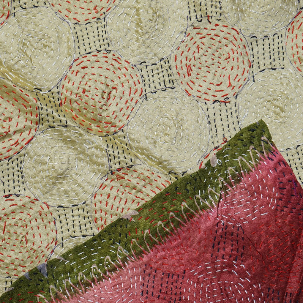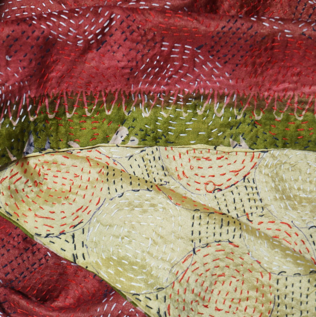 This kantha scarf is made with 2 layers of fine material overstitched by hand with different coloured threads in various repeating patterns, creating a visually charming and complex textile.
