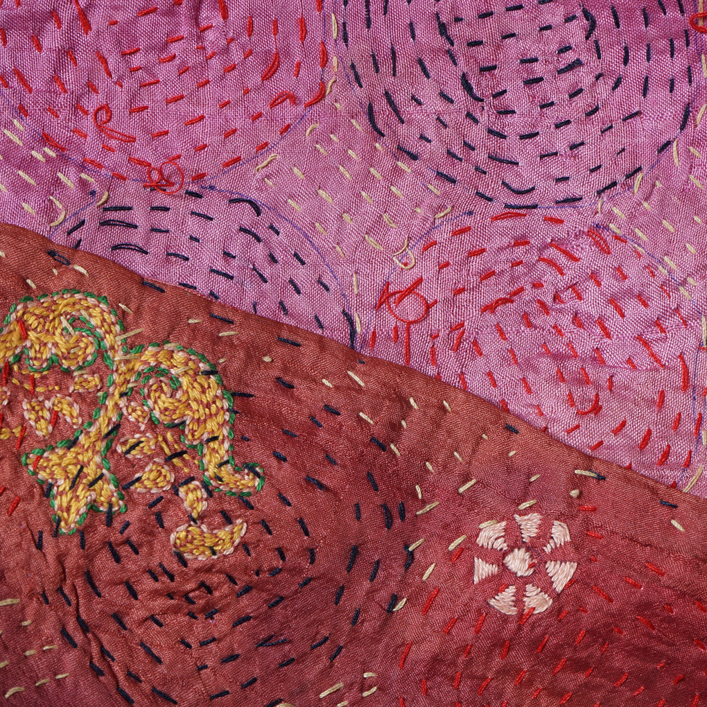 This kantha scarf is made with 2 layers of fine material overstitched by hand with different coloured threads in various repeating patterns, creating a visually charming and complex textile.