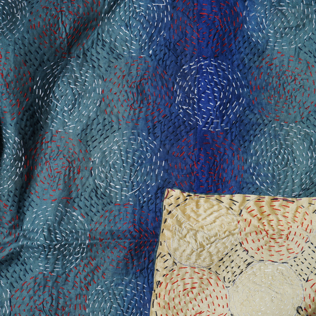 This kantha scarf is made with 2 layers of fine material overstitched by hand with different coloured threads in various repeating patterns, creating a visually charming and complex textile.