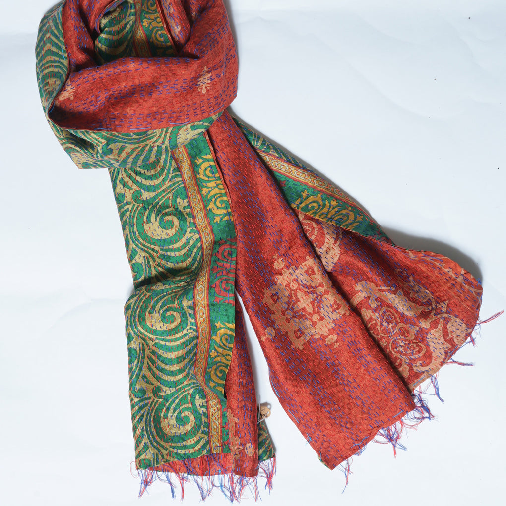 This kantha scarf is made with 2 layers of fine material overstitched by hand in straight lines with different coloured threads.