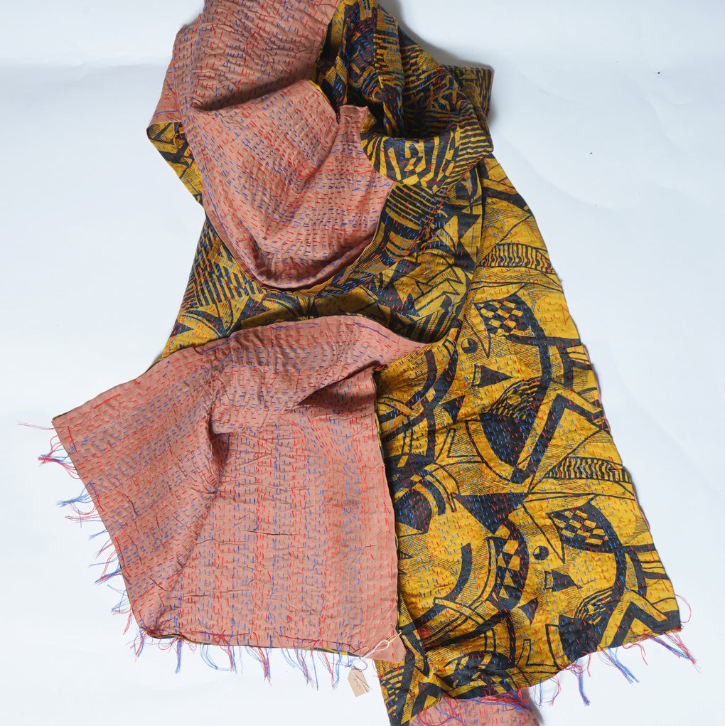 This kantha scarf is made with 2 layers of fine material overstitched by hand in straight lines with different coloured threads.