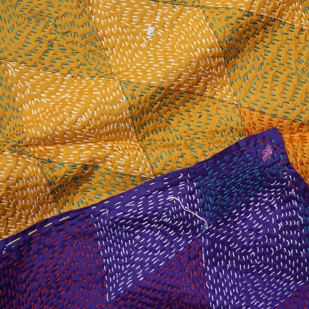 This kantha scarf is made with 2 layers of fine material overstitched by hand with different coloured threads in various repeating patterns, creating a visually charming and complex textile.
