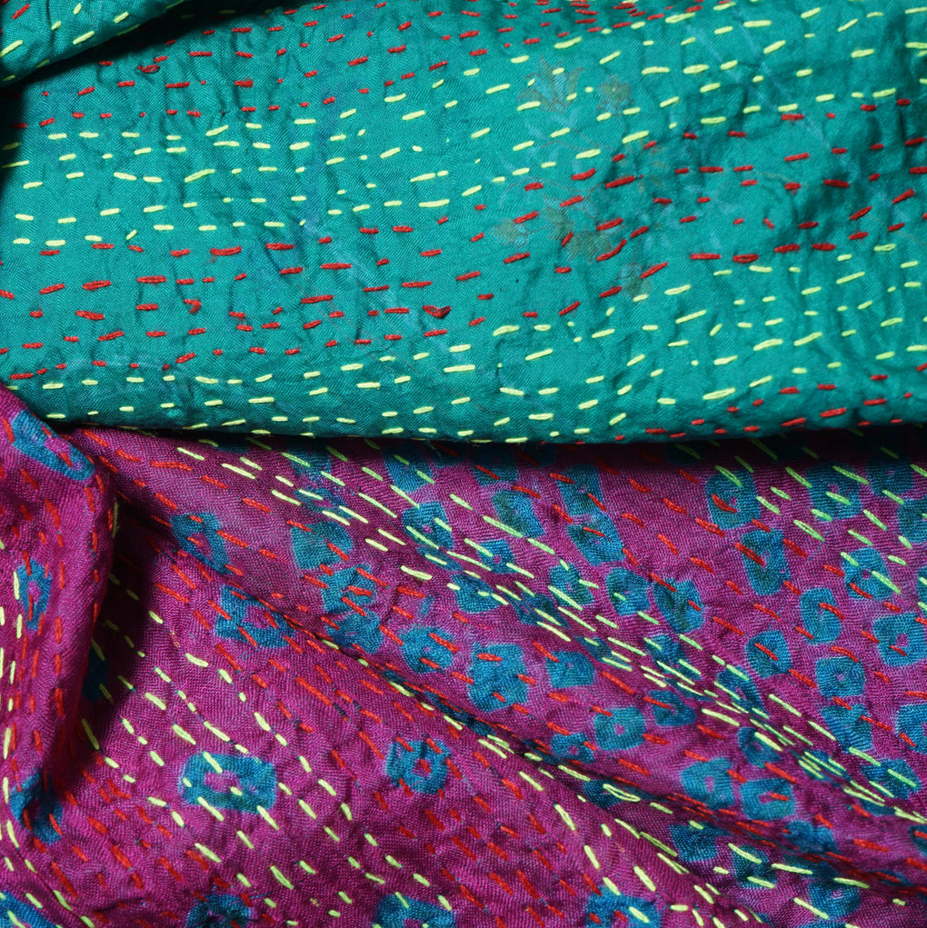 This kantha scarf is made with 2 layers of fine material overstitched by hand in straight lines with different coloured threads.