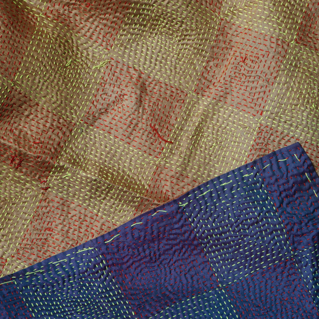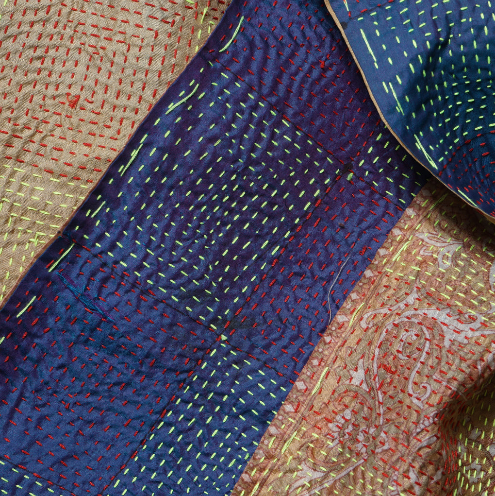 This kantha scarf is made with 2 layers of fine material overstitched by hand with different coloured threads in various repeating patterns, creating a visually charming and complex textile.
