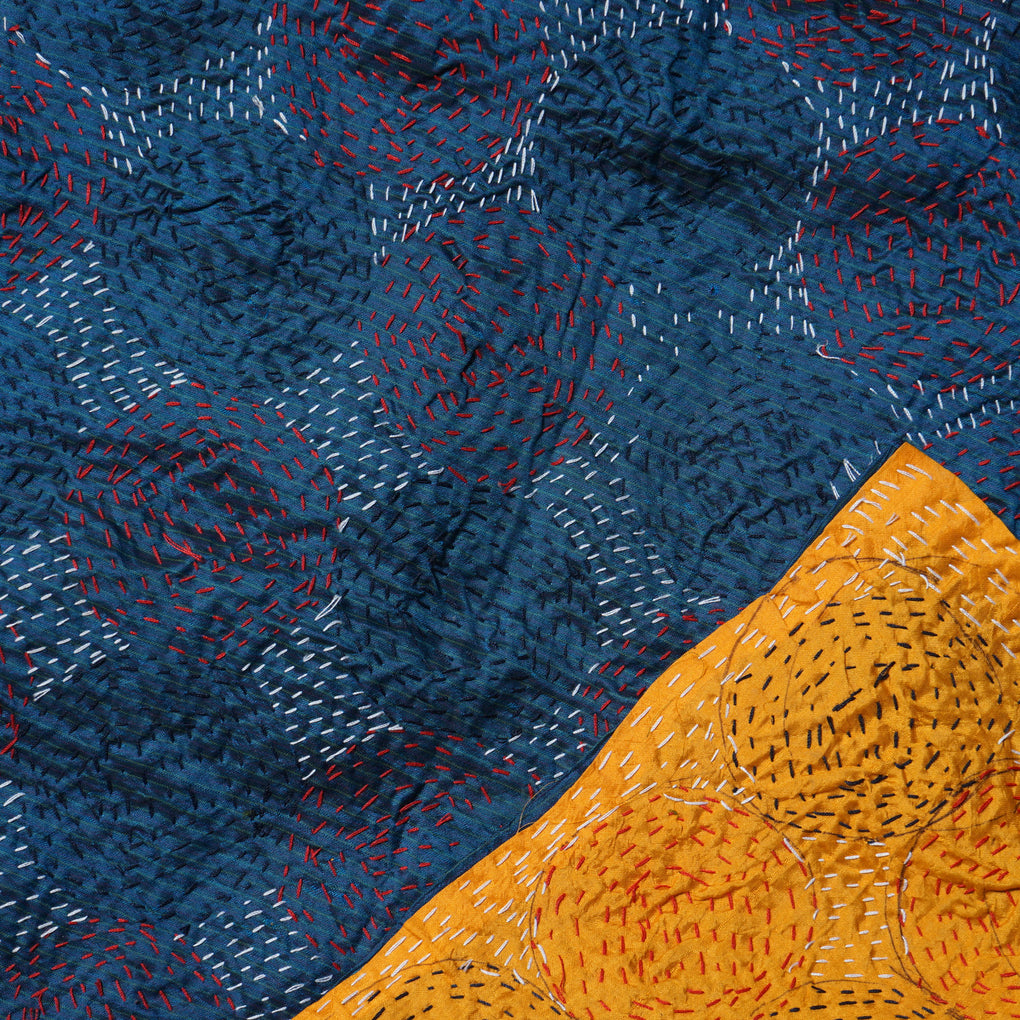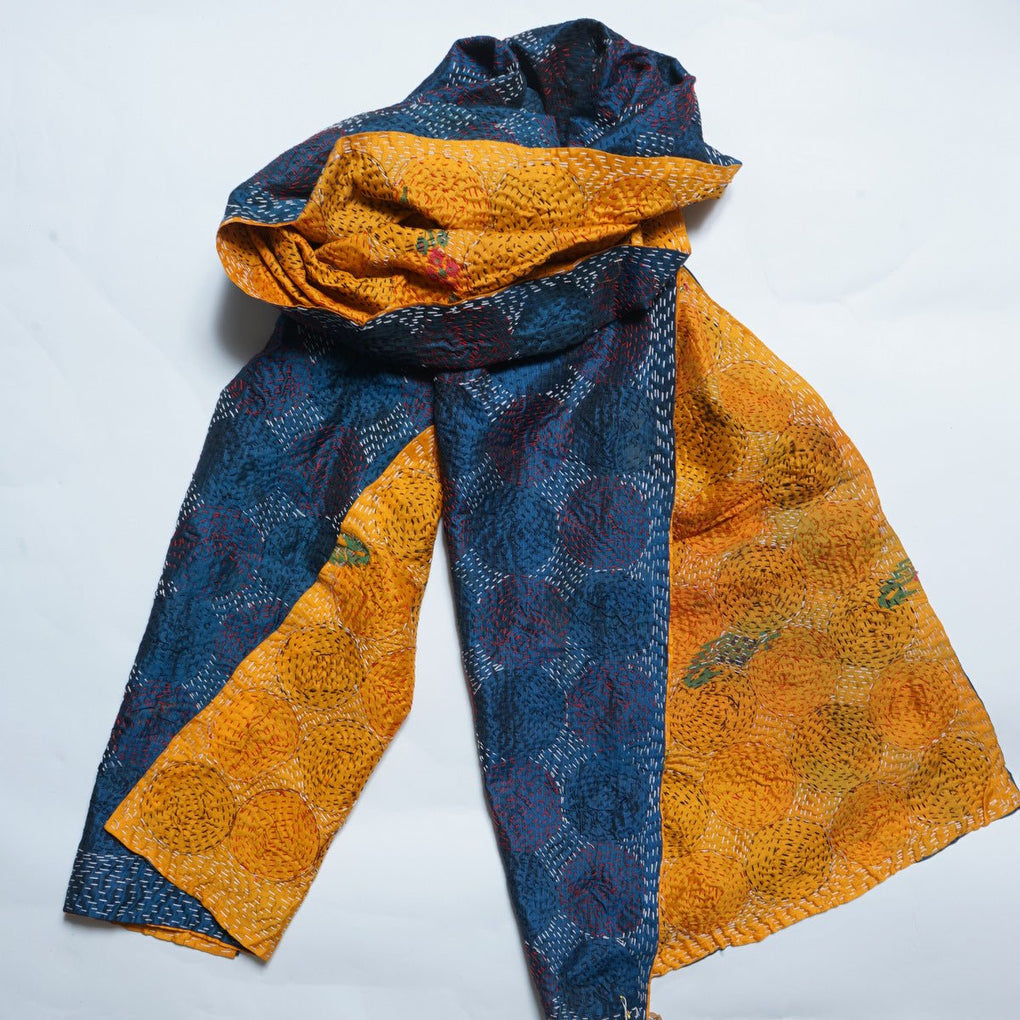This kantha scarf is made with 2 layers of fine material overstitched by hand with different coloured threads in various repeating patterns, creating a visually charming and complex textile.