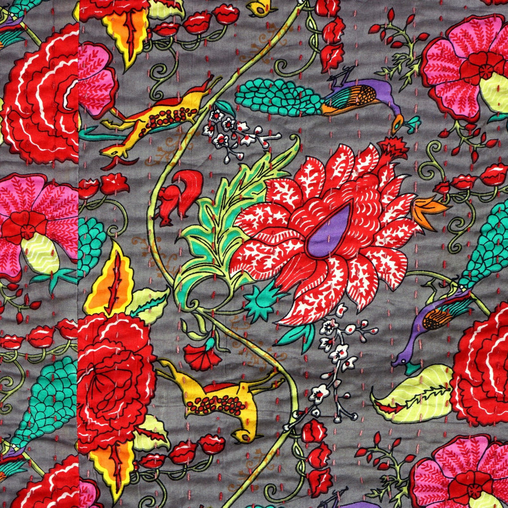 Traditional kantha stitch on two layers of pure cotton. The upper layer is screen printed.