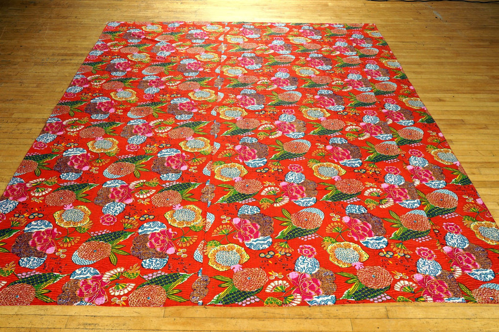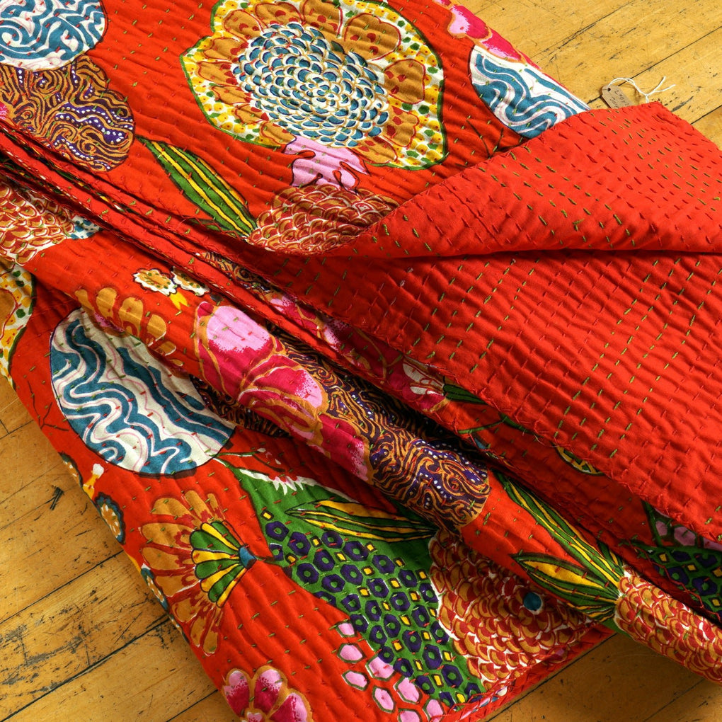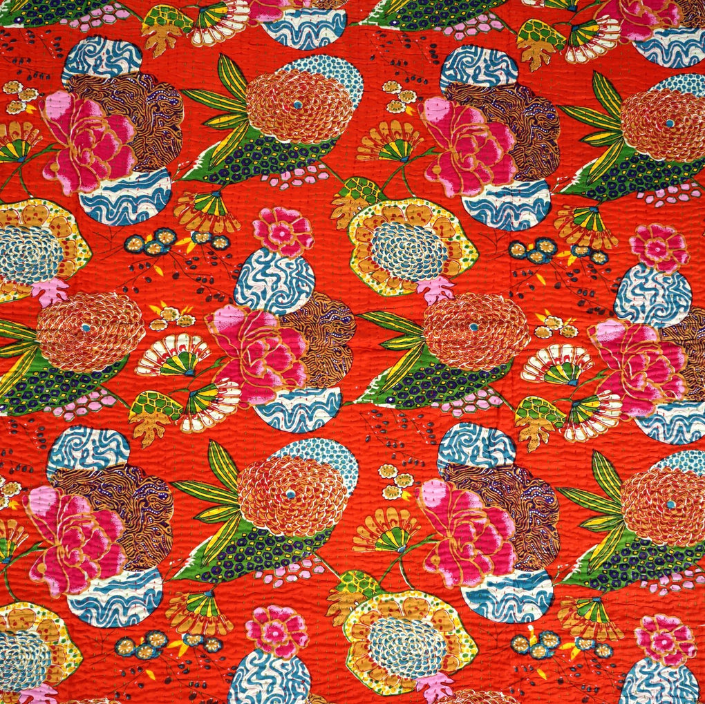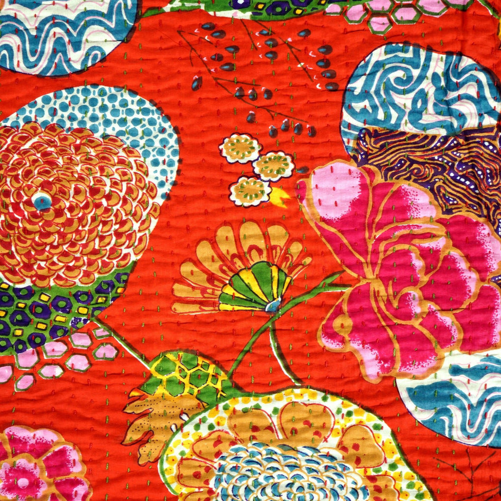 Traditional kantha stitch on two layers of pure cotton. The upper layer is screen printed.