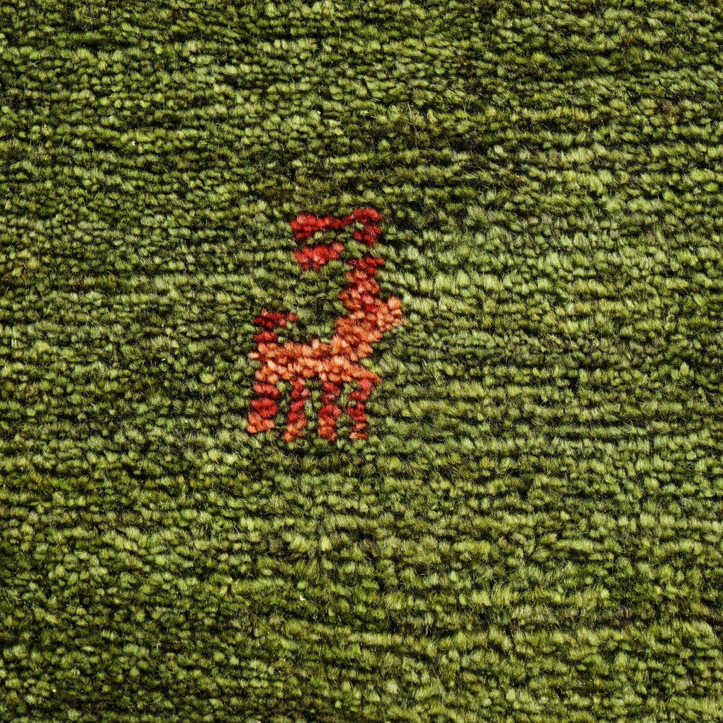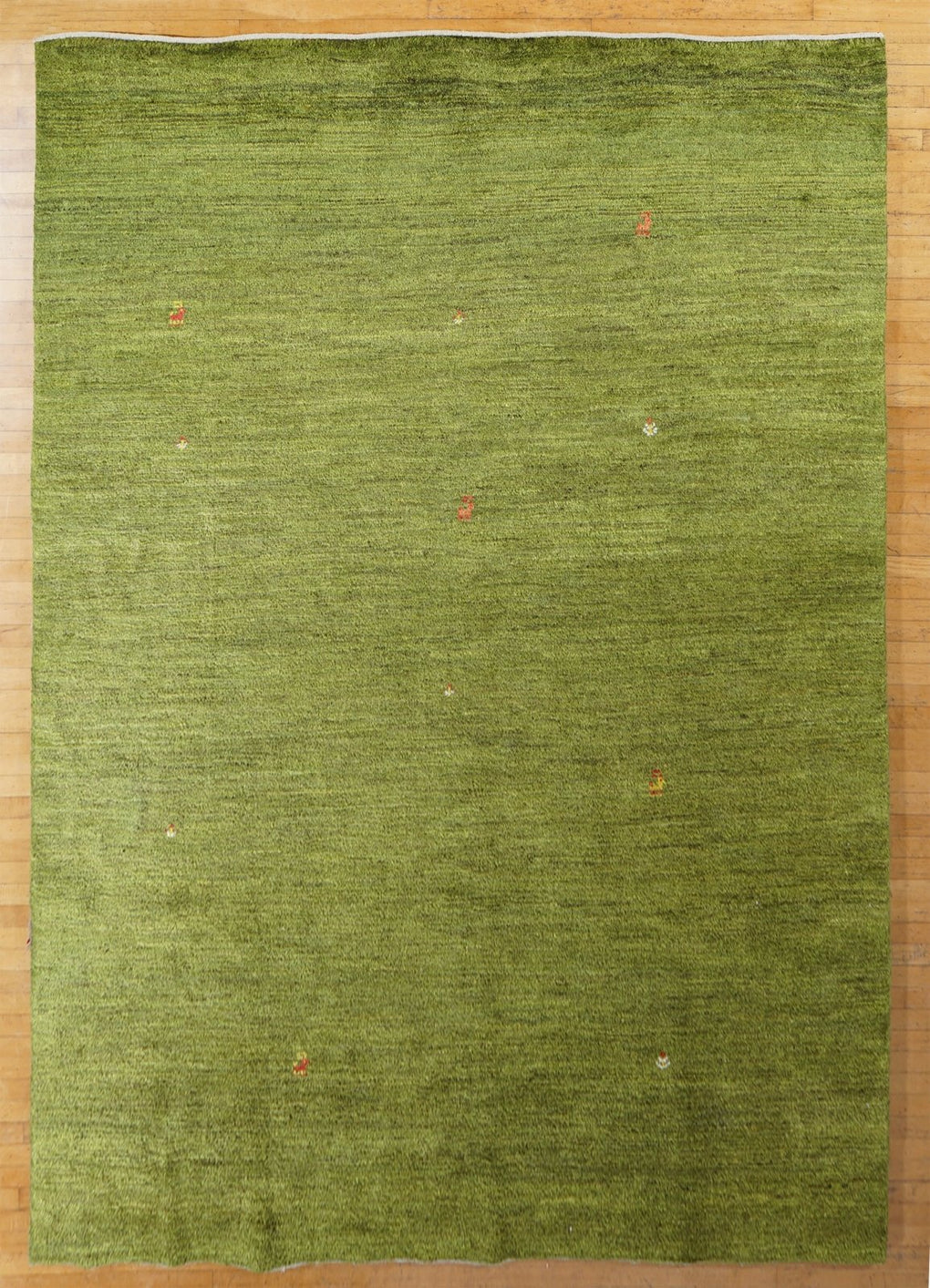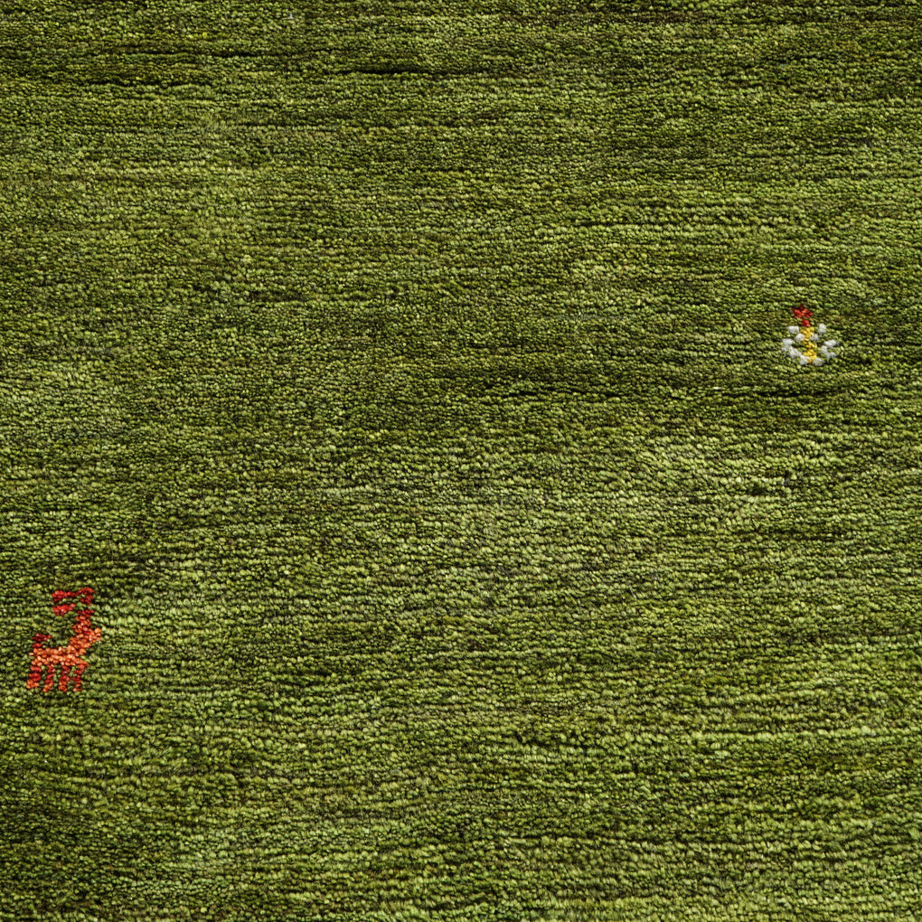 A stunning, large natural green gabbeh carpet, with some small visitors plucked from the imagination of the weaver. It is hard to beat the raw natural look and feel of this carpet.