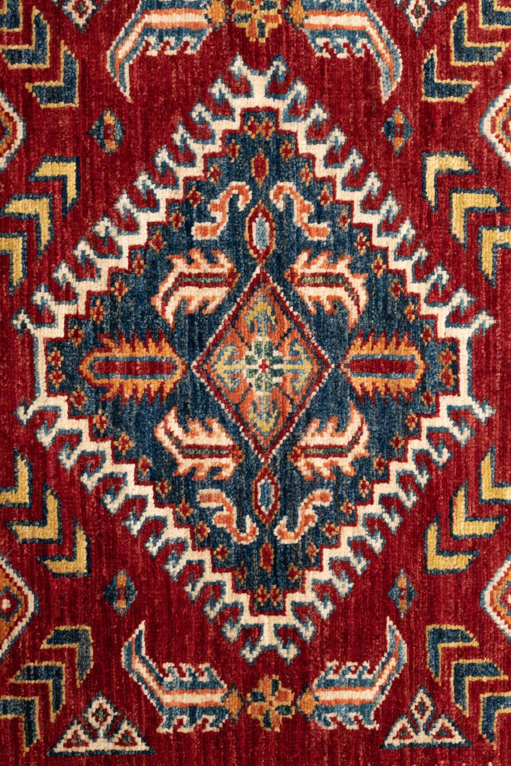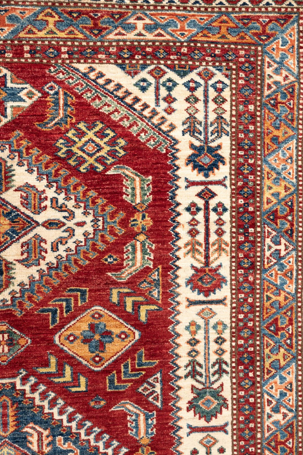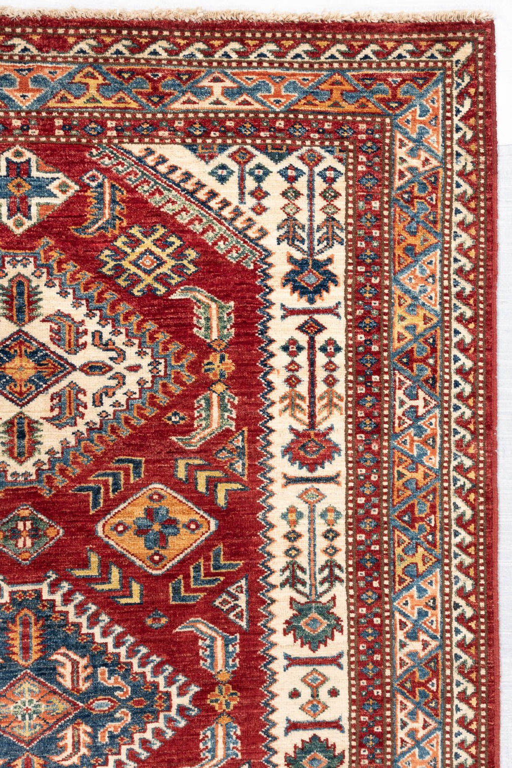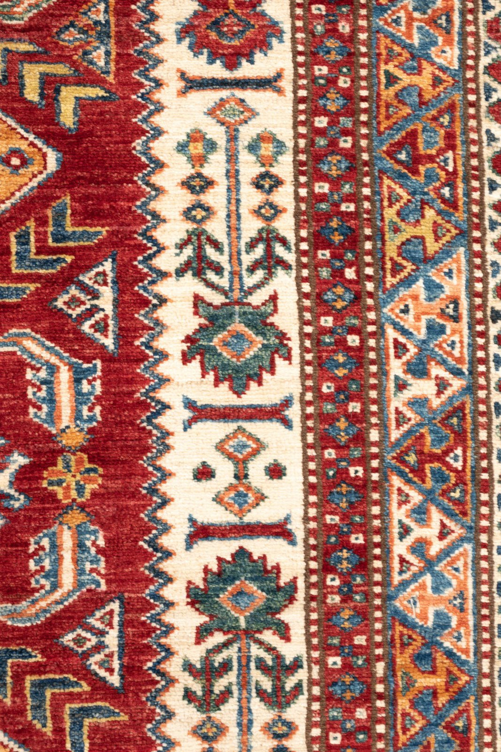 Lovely silky quality wool and finely knotted design convey the jewel like pattern Kazak rugs are known for.