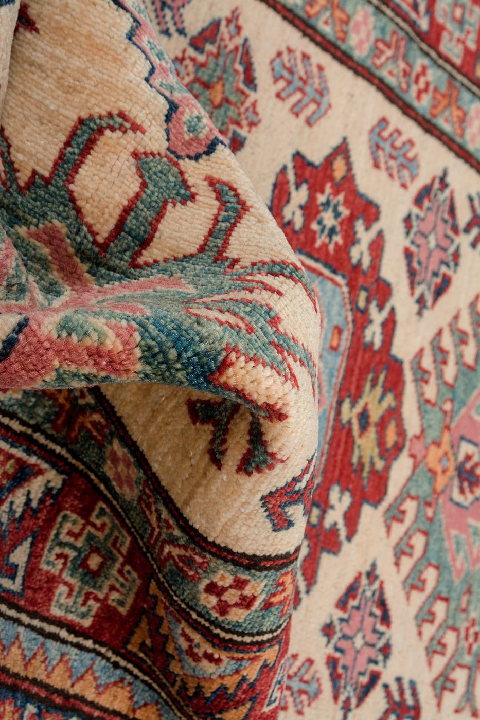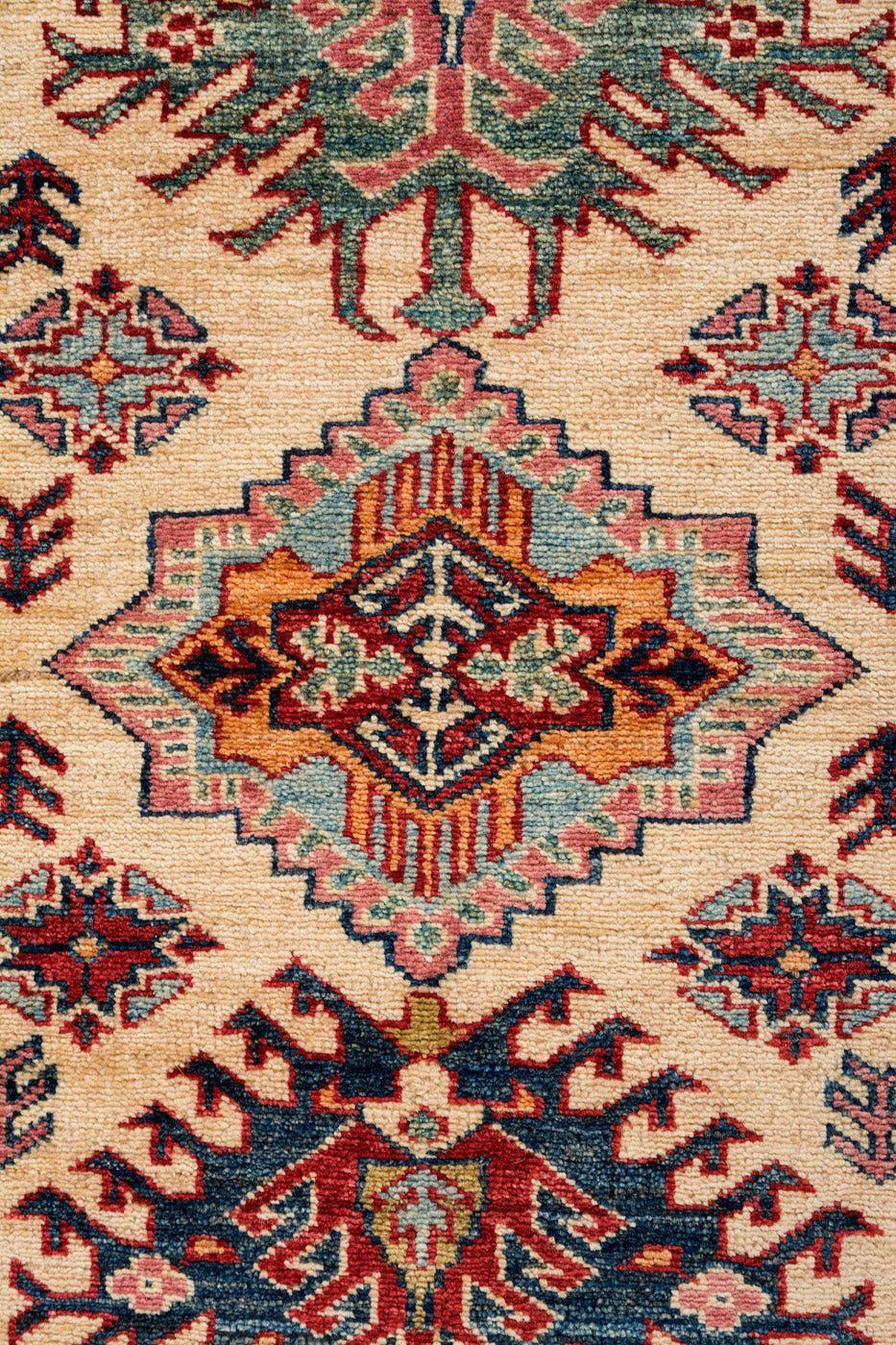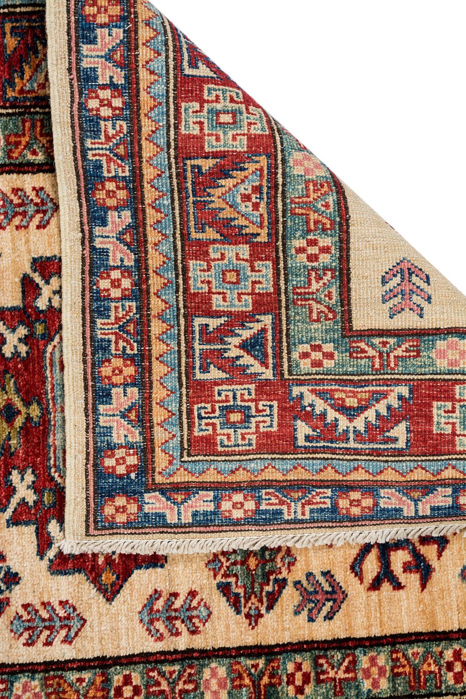 Lovely silky quality wool and finely knotted design convey the jewel like pattern Kazak rugs are known for.