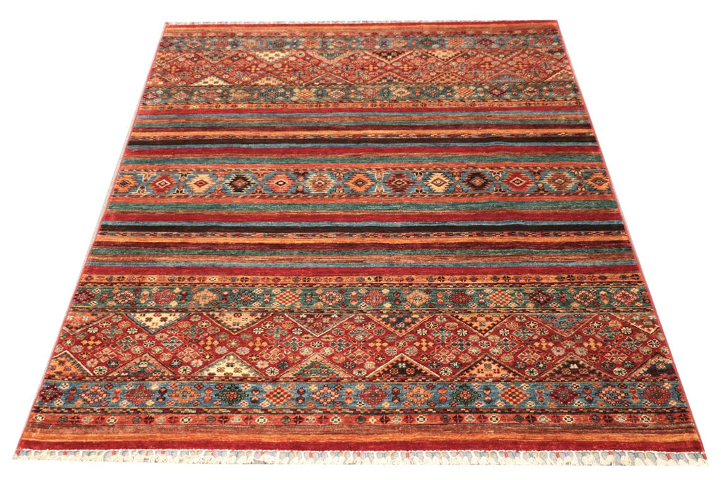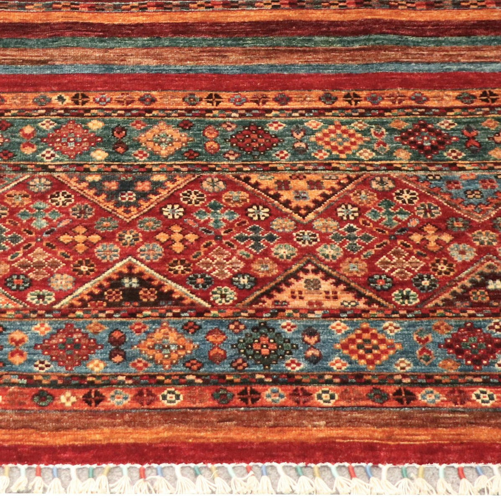 100% wool hand knotted, hand spun and natural dyes. A contemporary interpretation of tribal motifs. Exceptional quality.