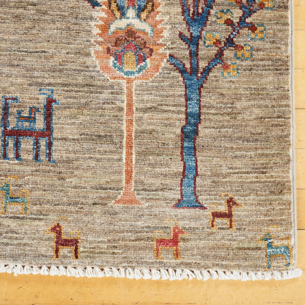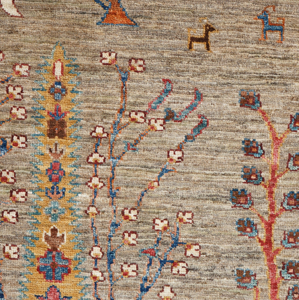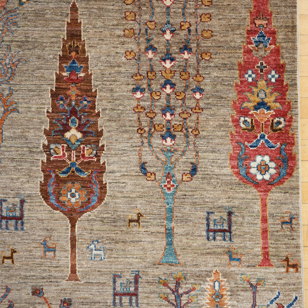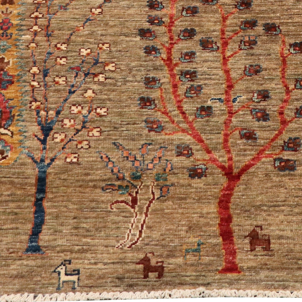 Finely hand woven pictorial rug featuring tree of life motifs with lovely soft colours.