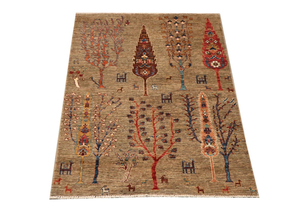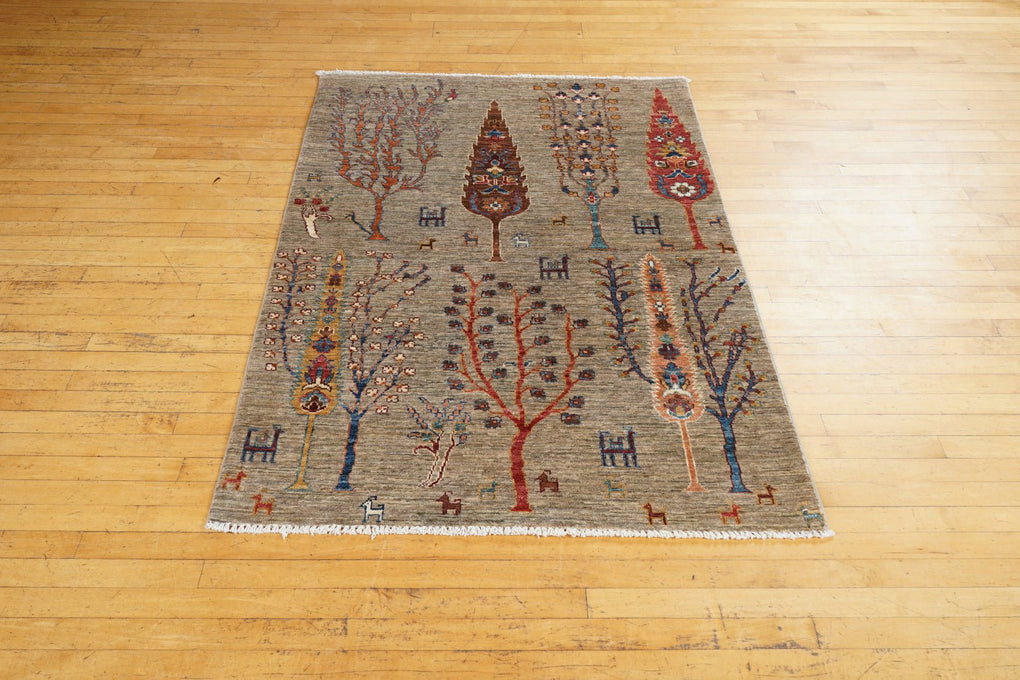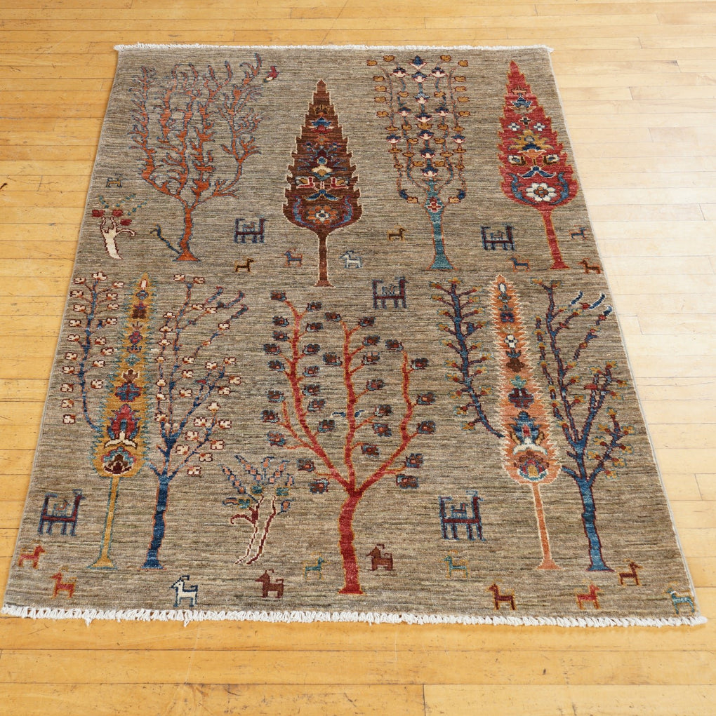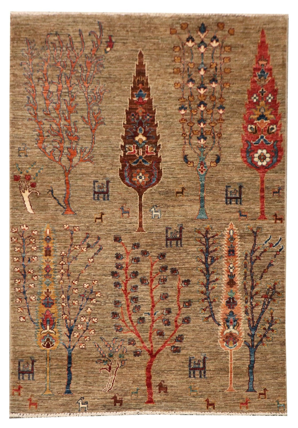 Finely hand woven pictorial rug featuring tree of life motifs with lovely soft colours.