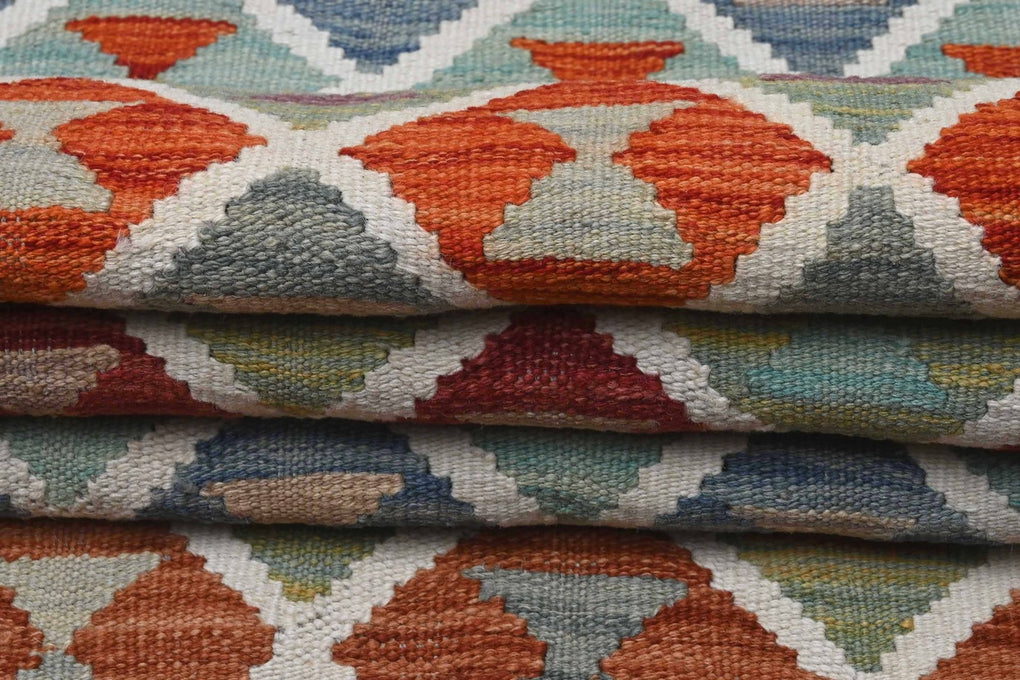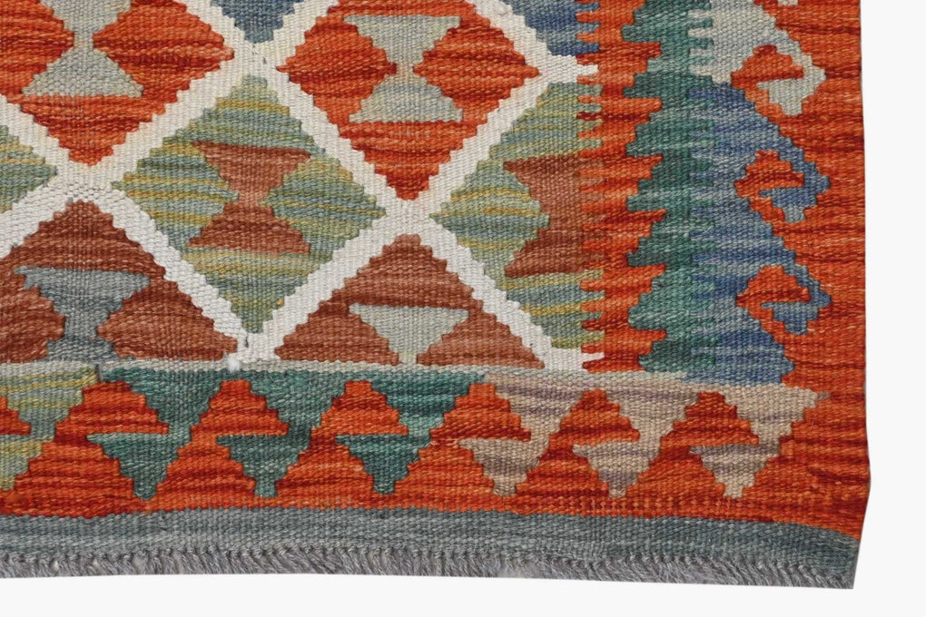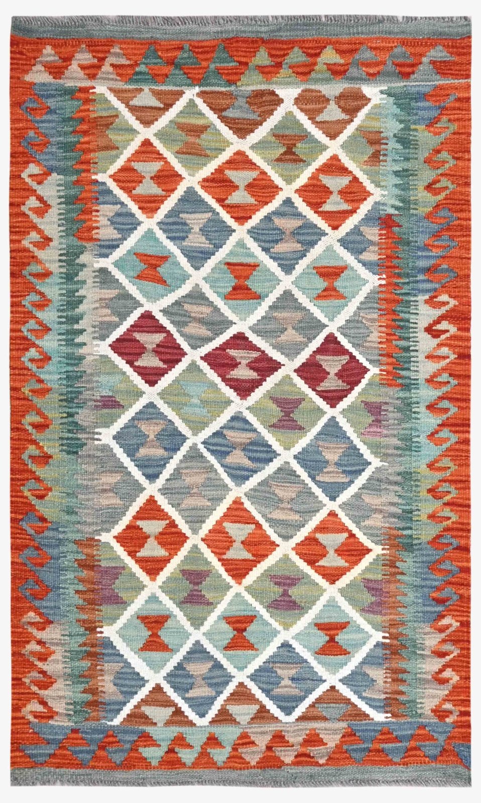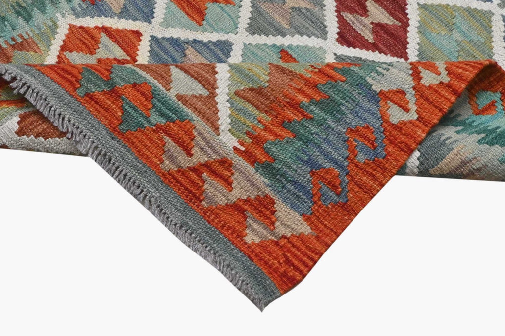 Classic trellis pattern has lively and well balanced colours. This hand woven kilim (means flat weave) comes from the northern region of Afghanistan. The dyes are all vegetable based and the wool is 100% hand spun.