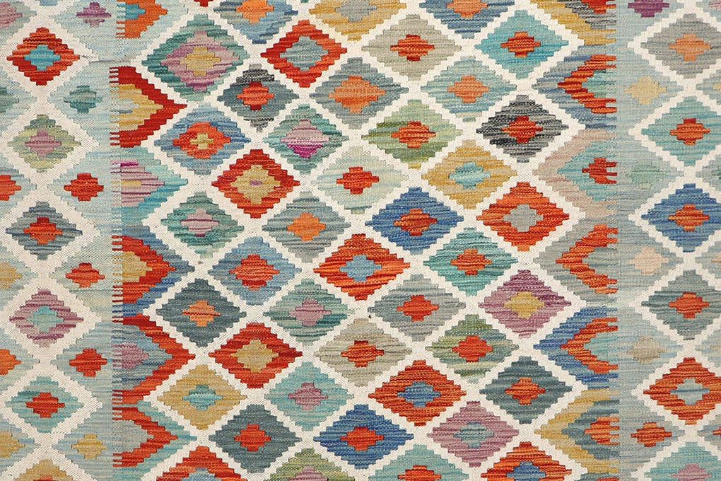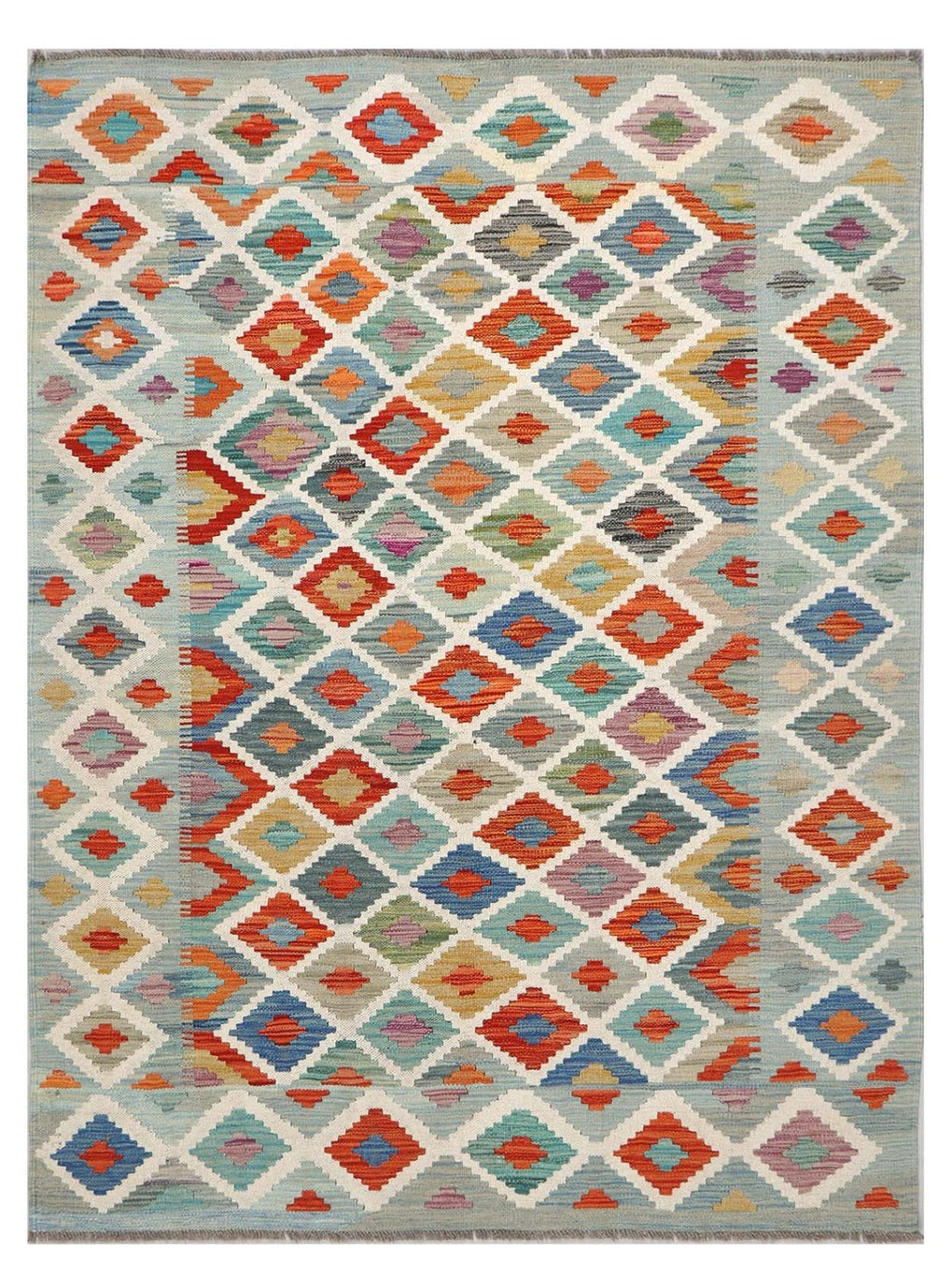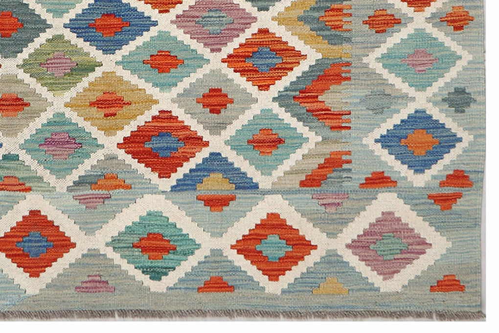 Classic trellis pattern has lively and well balanced colours. This hand woven kilim (means flat weave) comes from the northern region of Afghanistan. The dyes are all vegetable based and the wool is 100% hand spun.