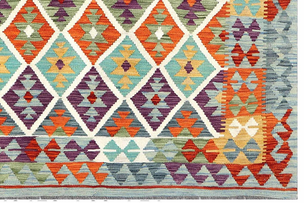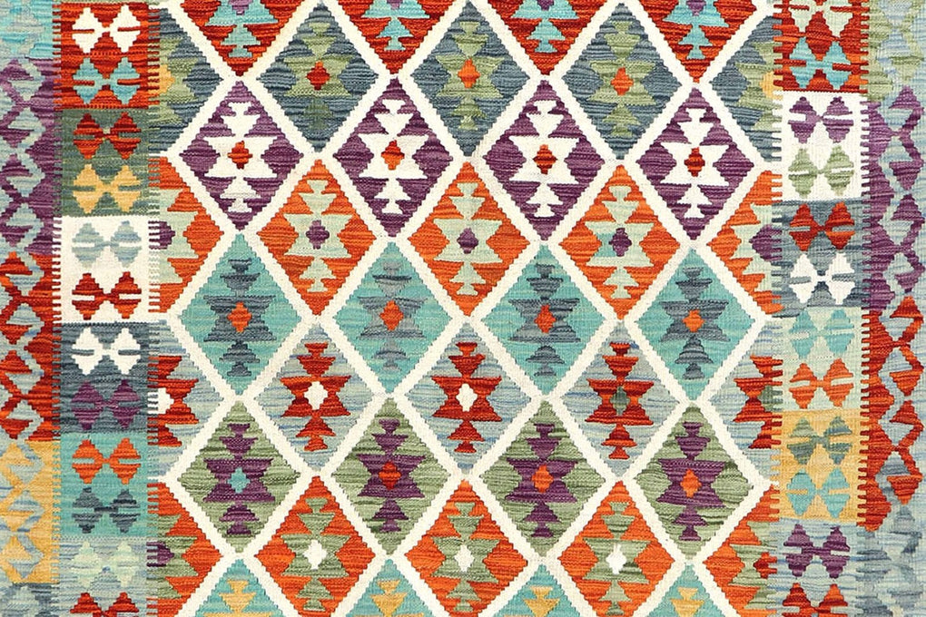Classic trellis pattern has lively and well balanced colours. This hand woven kilim (means flat weave) comes from the northern region of Afghanistan. The dyes are all vegetable based and the wool is 100% hand spun.