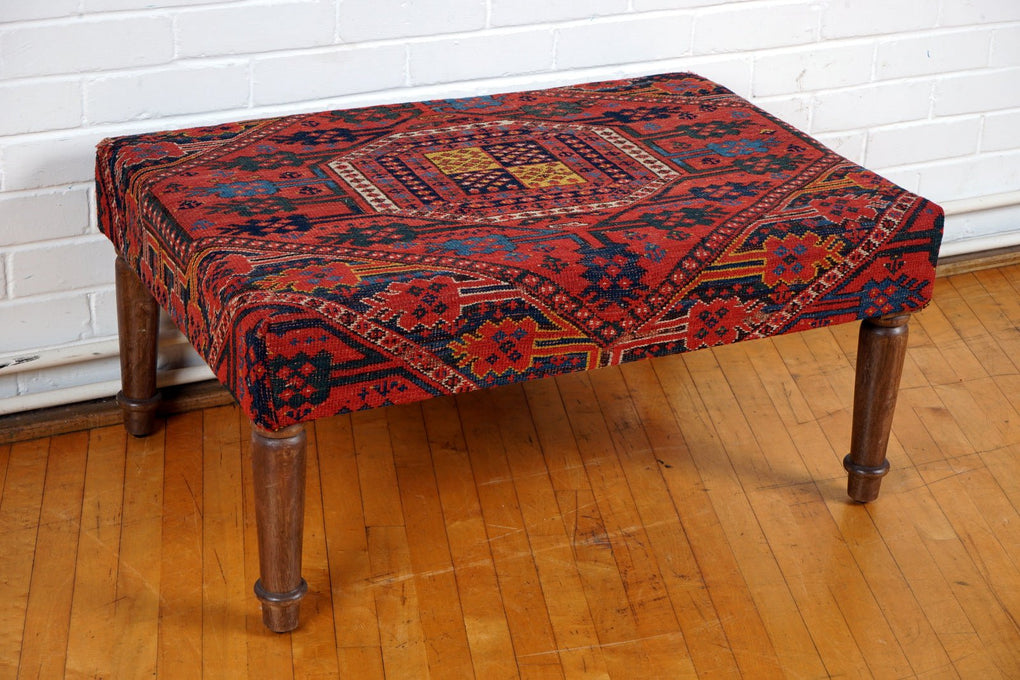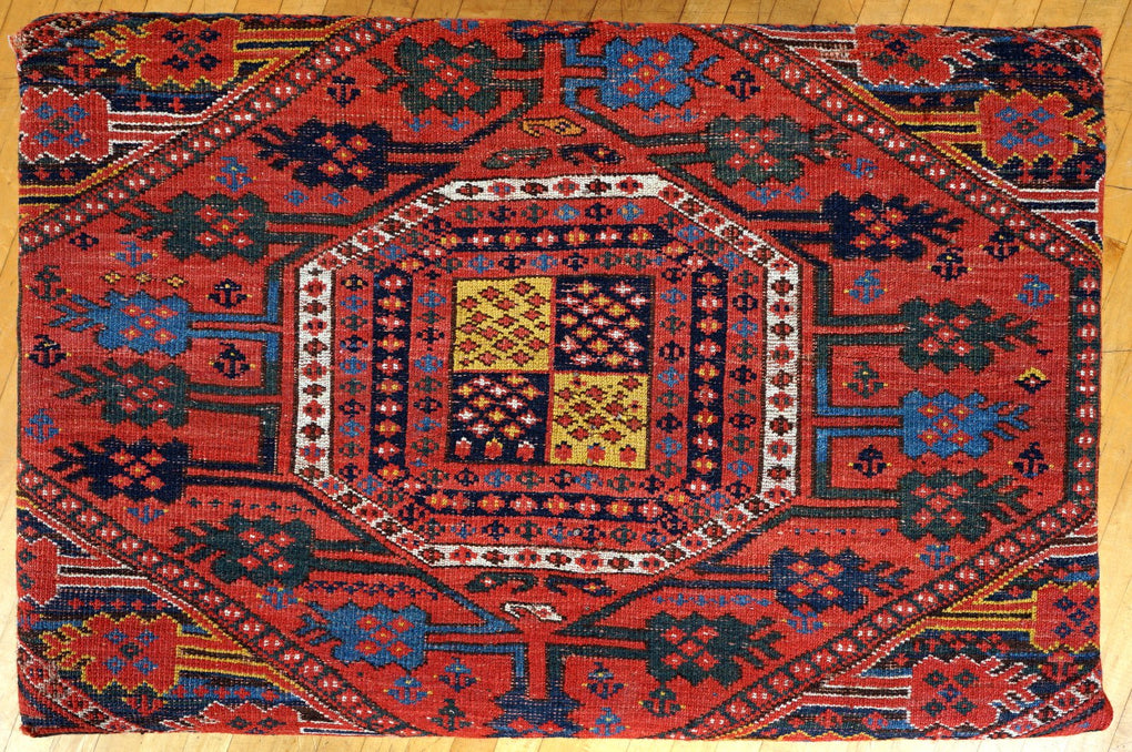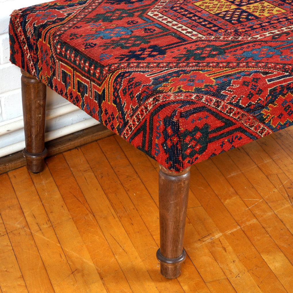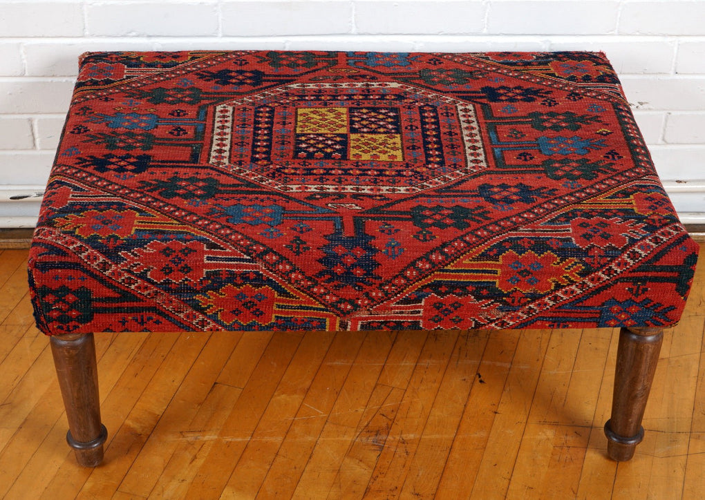 Hardwood frame covered in 19th century Beshir carpet fragment.