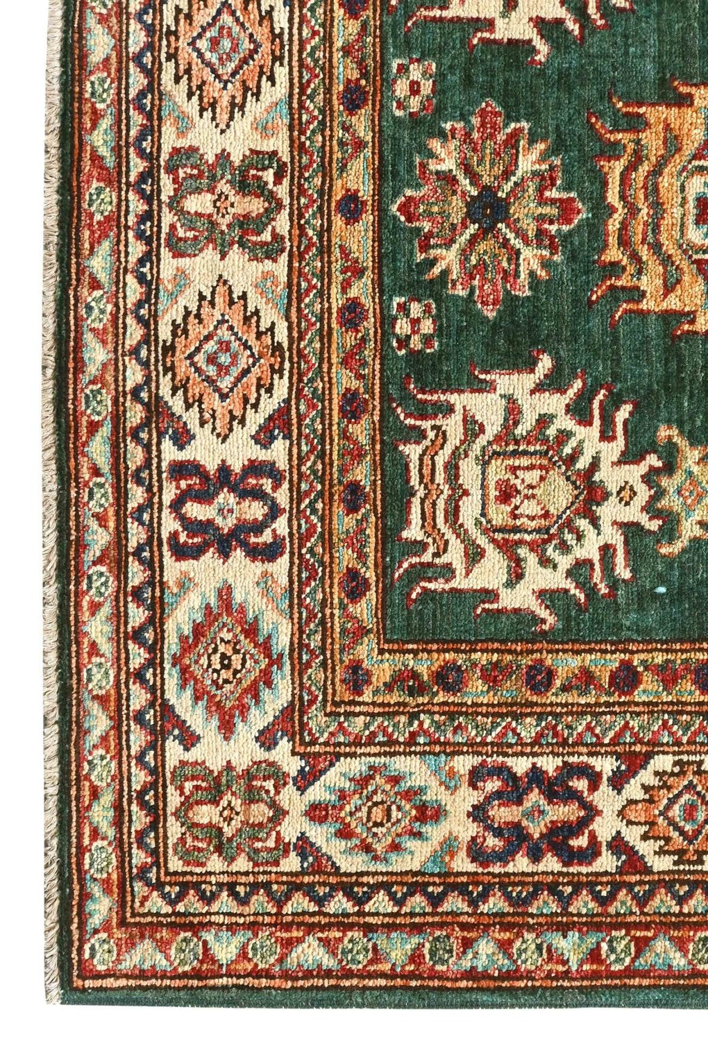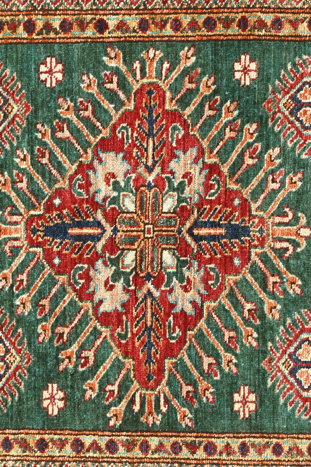 Lovely silky quality wool and finely knotted design convey the jewel like pattern Kazak rugs are known for.