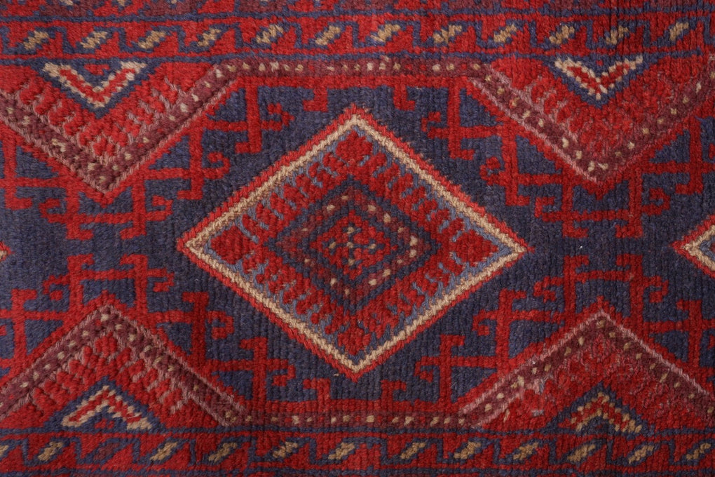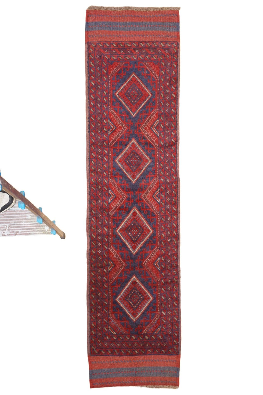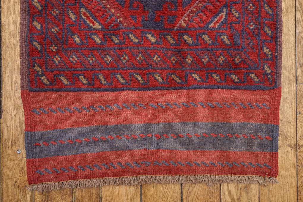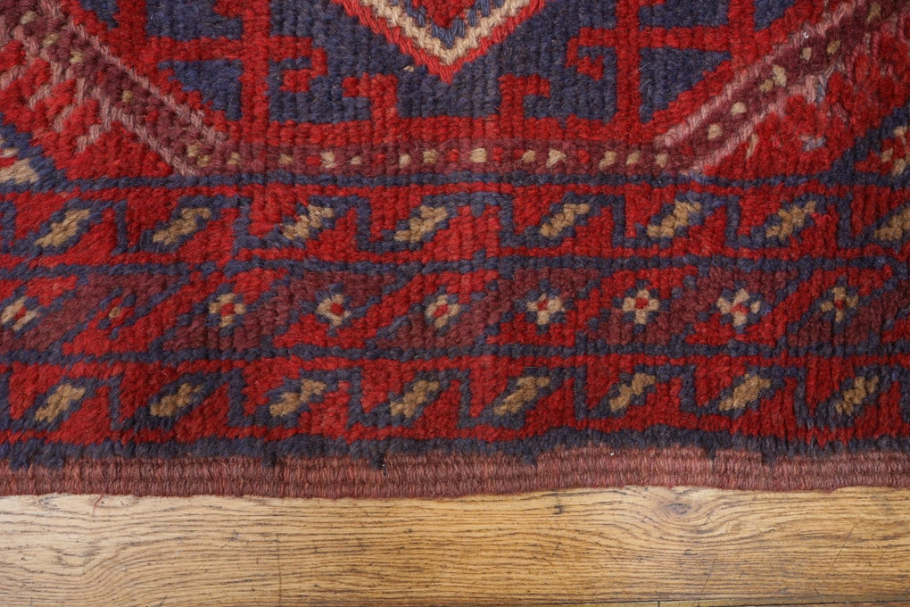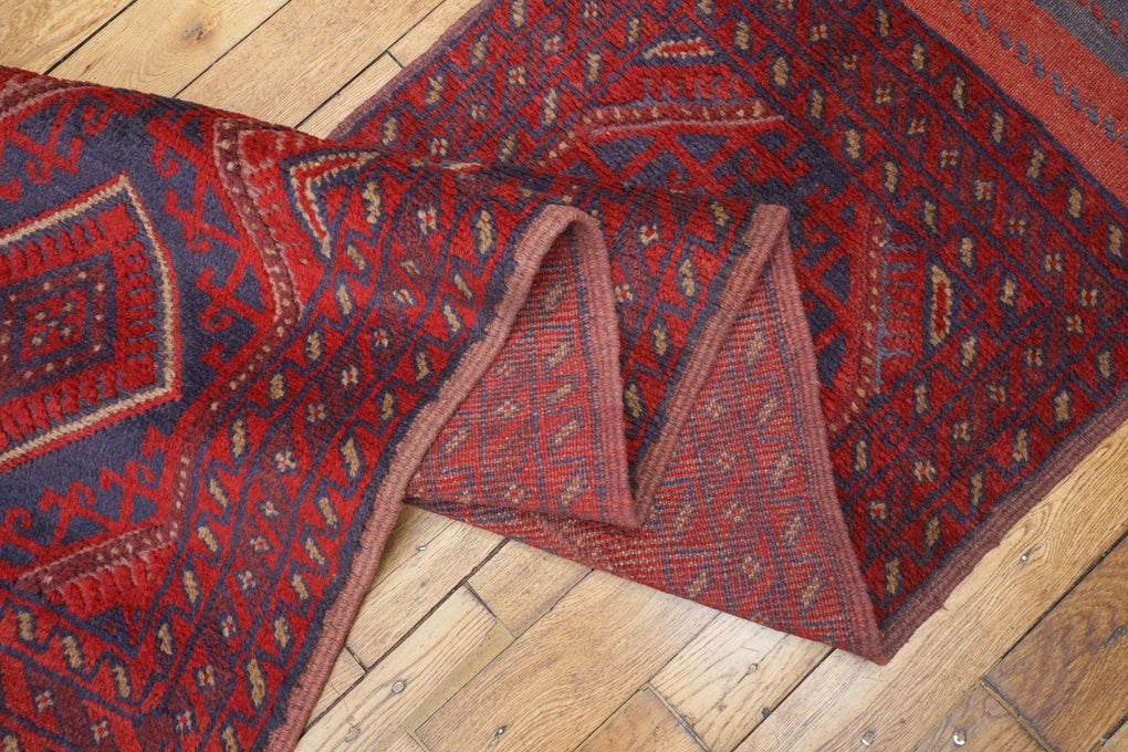 Woven in Afghanistan, the Mushwani specialise in dual technique pieces such as this. There is 'sumak' weave which is a supplementary weft , next to pile weave or knotted technique. Both are finely executed making a refined texture. The field pattern is elegantly framed by the border.