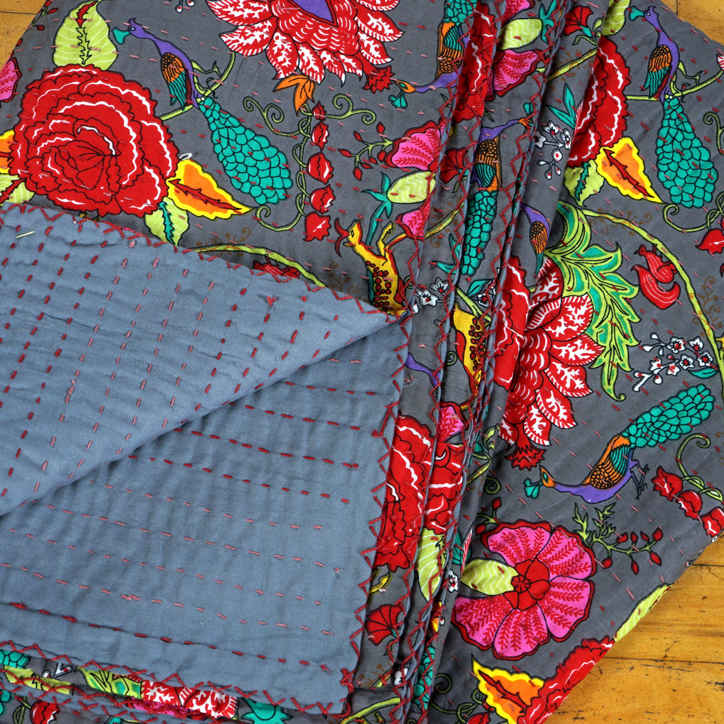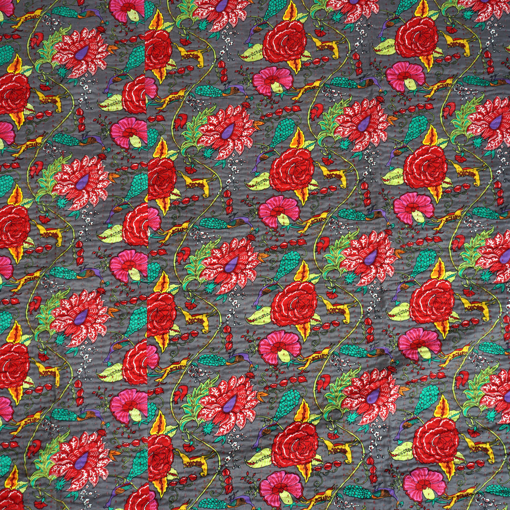 Traditional kantha stitch on two layers of pure cotton. The upper layer is screen printed.