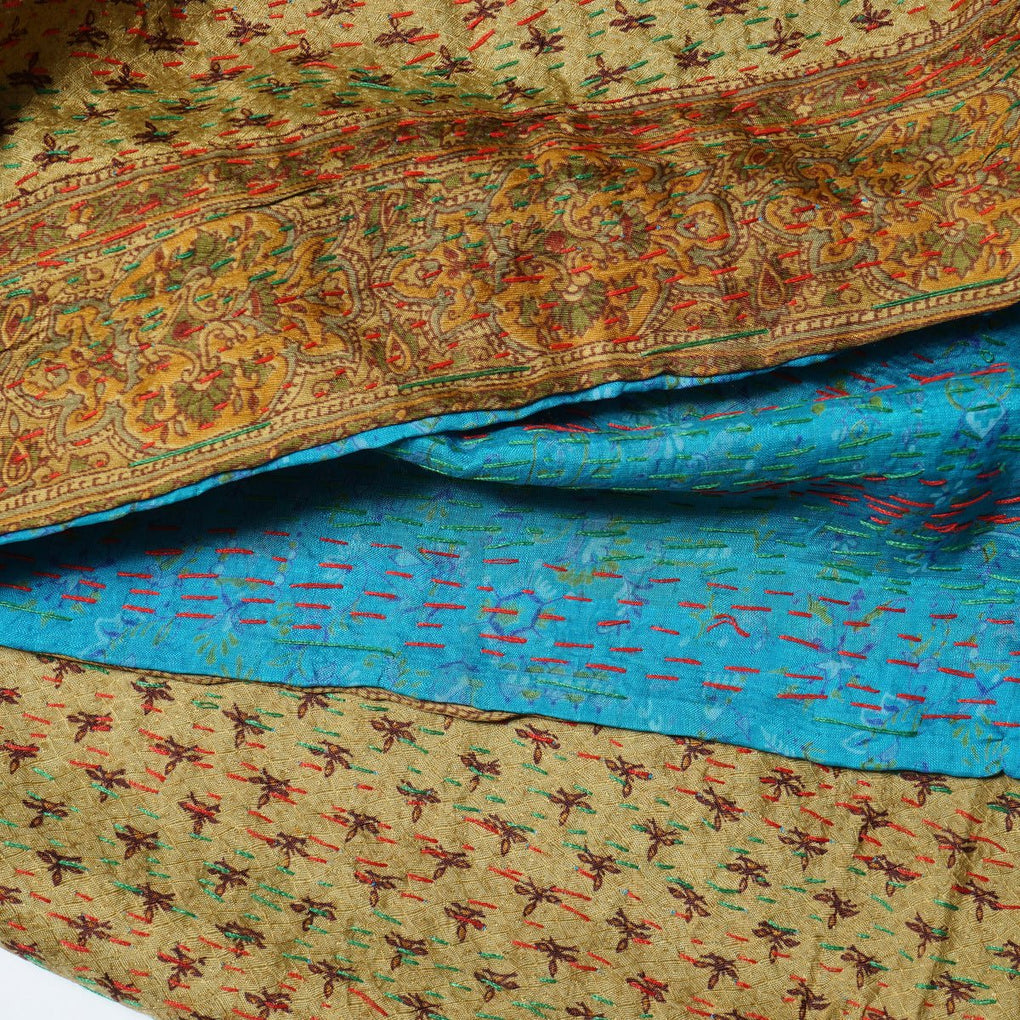 This kantha scarf is made with 2 layers of fine material overstitched by hand in straight lines with different coloured threads.