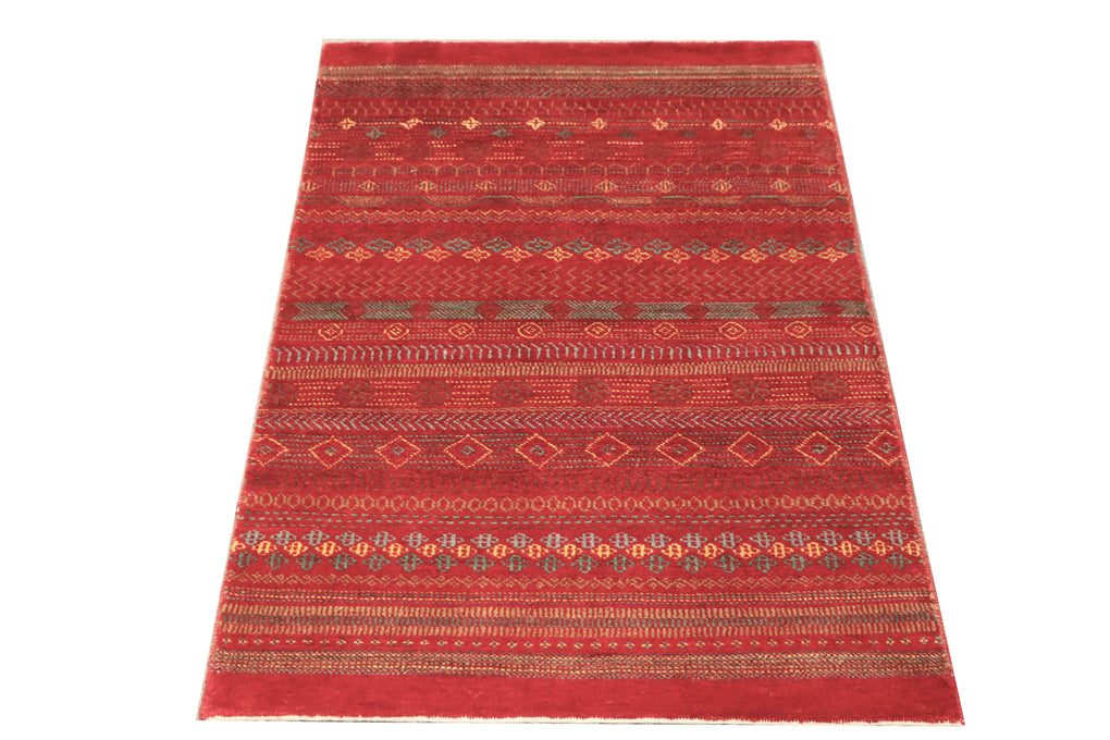 A contemporary design using bands of traditional motifs. Thick and silky wool.