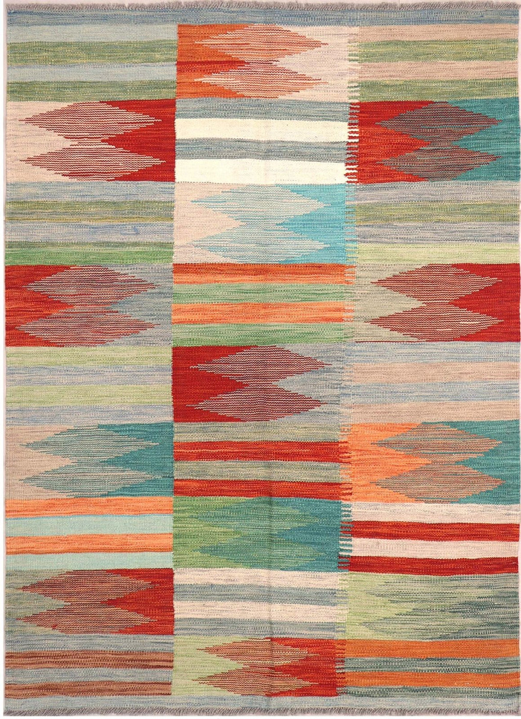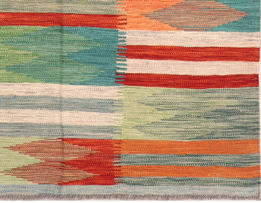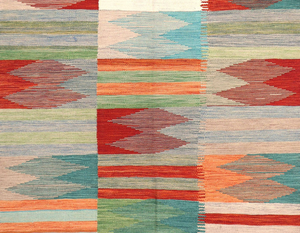 Classic trellis pattern has lively and well balanced colours. This hand woven kilim (means flat weave) comes from the northern region of Afghanistan. The dyes are all vegetable based and the wool is 100% hand spun.